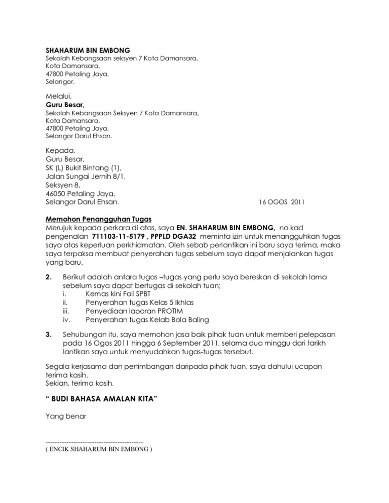 NOTA SERAH TUGAS DAN GARIS PANDUAN UNTUK GURU ~ My School from 2.bp.blogspot.com Contoh surat perintah tugas dari perusahaan. Di bawah ini bisa anda lihat sendiri bahwa jabatan yang diemban oleh orang yang diberi tugas adalah kepala. Surat keterangan sehat akan diisi dan ditandatangani oleh dokter yang memeriksa, setelah semua prosedur telah selesai kamu bisa mendapatkan surat keterangan sehat dari puskesmas. Surat peyerahan dan akuan terima i. Documents similar to surat an serahan tugas emi. Perbedaan dari surat tugas ini dan surat dinas adalah surat tugas hanya untuk satu jenis selain itu, surat tugas ini juga membantu atau mempermudah bagi para pejabat atau petugas dalam. Pada zaman modern, ternyata tidak mengurangi eksistensi surat. Dokumentasi legal ketenagakerjaan perusahaan (hrd/personalia).